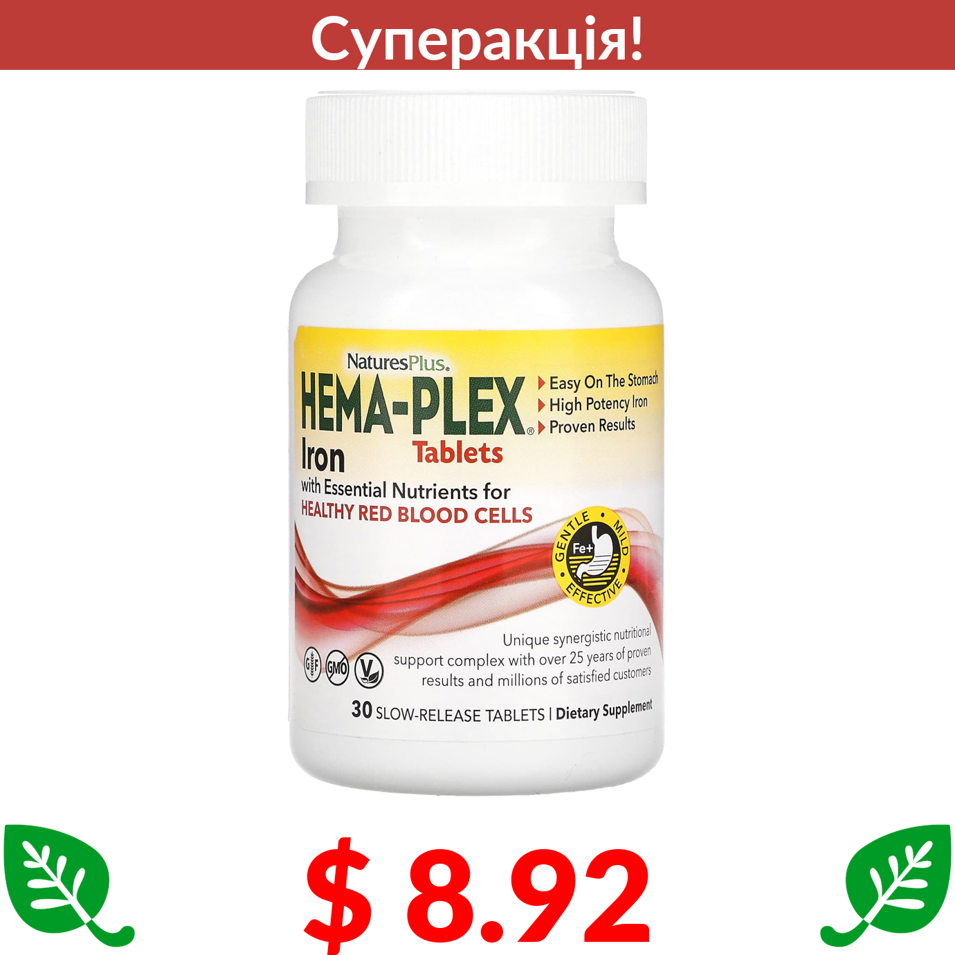 $ 8.92 Nature's Plus, Hema-Plex, Iron with Essential Nutrients for Healthy Red Blood Cells, 30 Slow Release Tablets