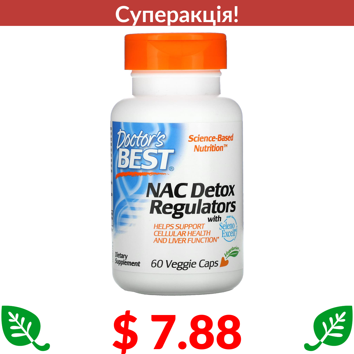 $ 7.88 Doctor's Best, N-ацетилцистеїн (NAC) для регуляції процесу детоксикації, 60 рослинних капсул