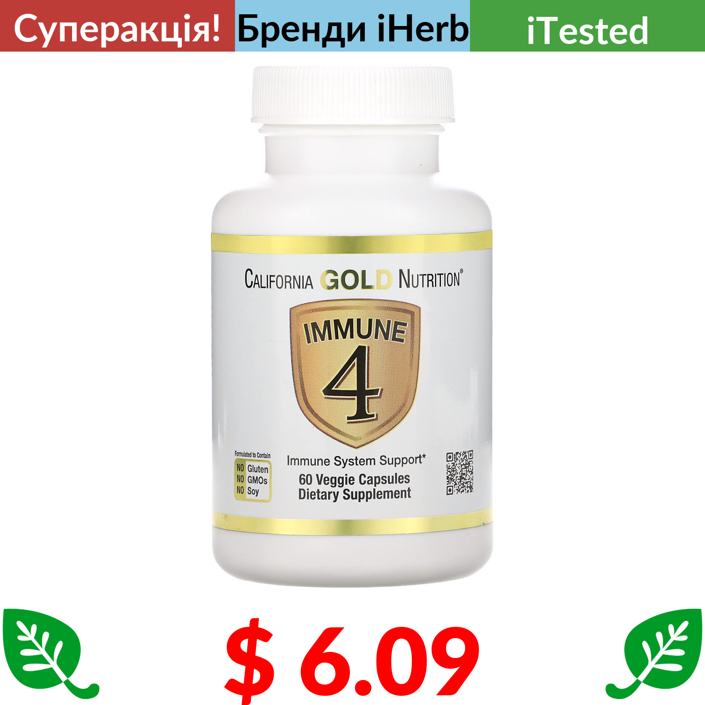 $ 6.09 California Gold Nutrition, Immune 4, засіб для зміцнення імунітету, 60 вегетаріанських капсул