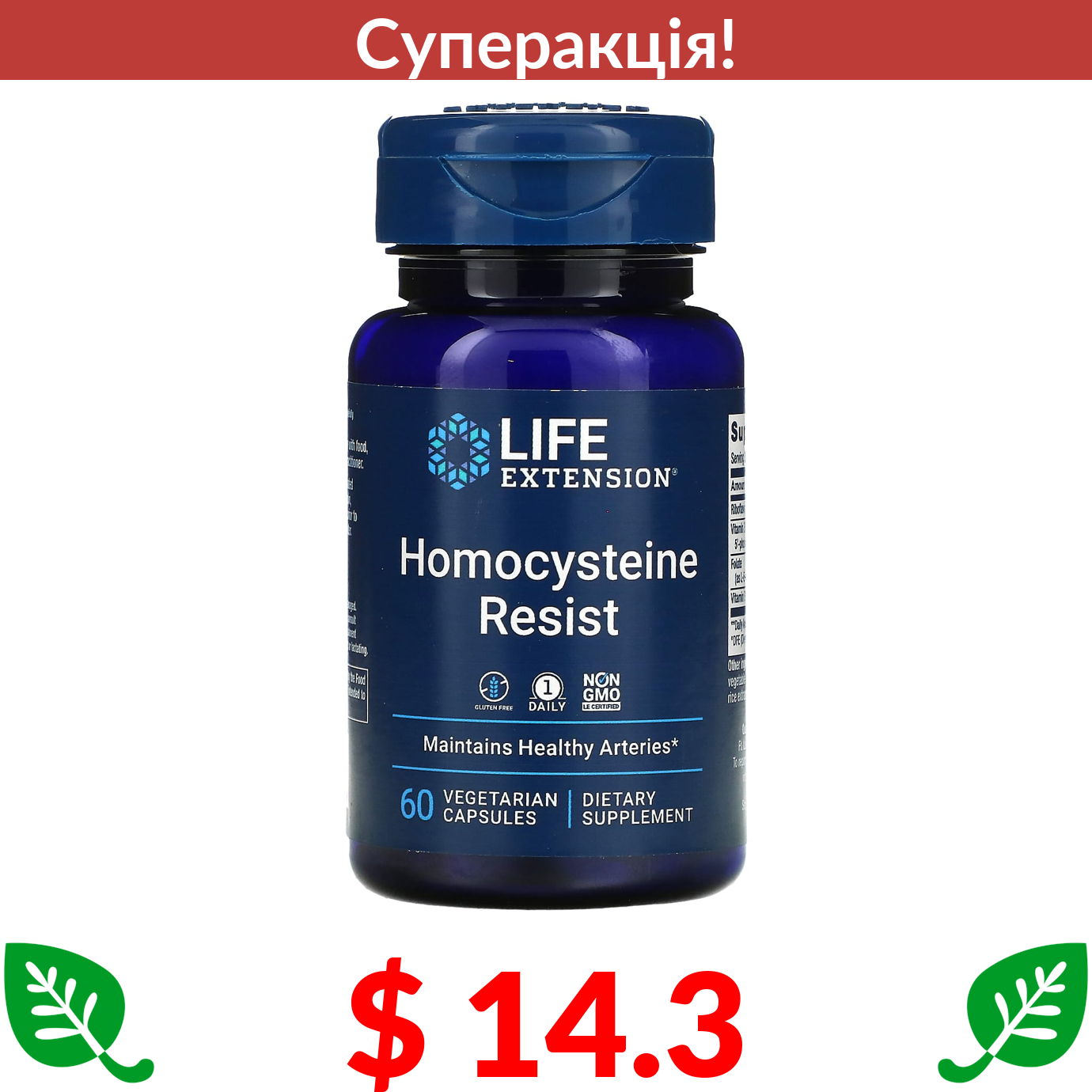 $ 14.3 Life Extension, Homocysteine Resist, добавка для підтримання рівня гомоцистеїну, 60 вегетаріанських капсул