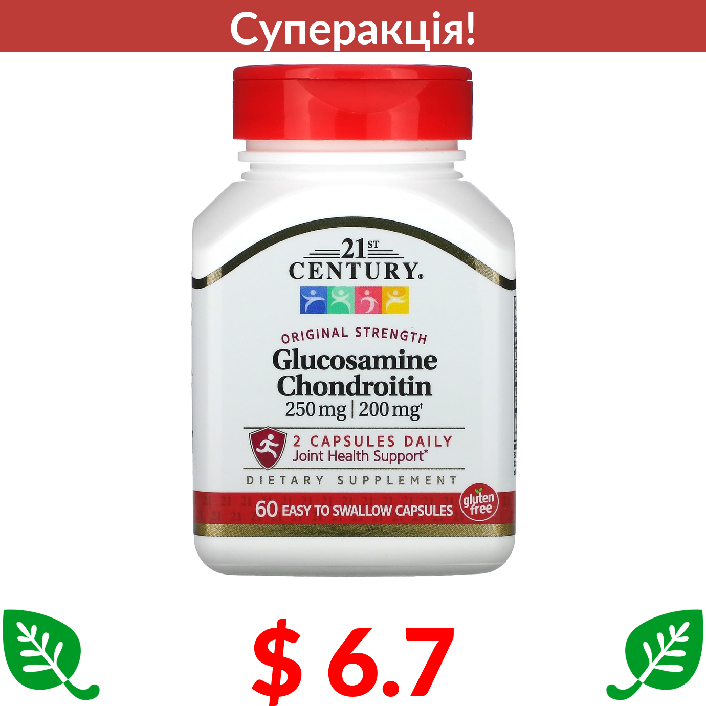 $ 6.7 21st Century, глюкозамін і хондроїтин звичайної дії, 250 мг та 200 мг, 60 капсул, які легко ковтати