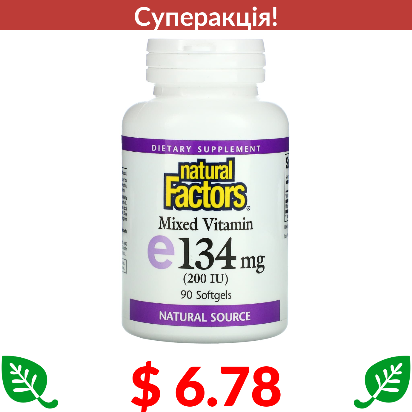 $ 6.78 Natural Factors, змішаний вітамін E, 200 МО, 90 капсул