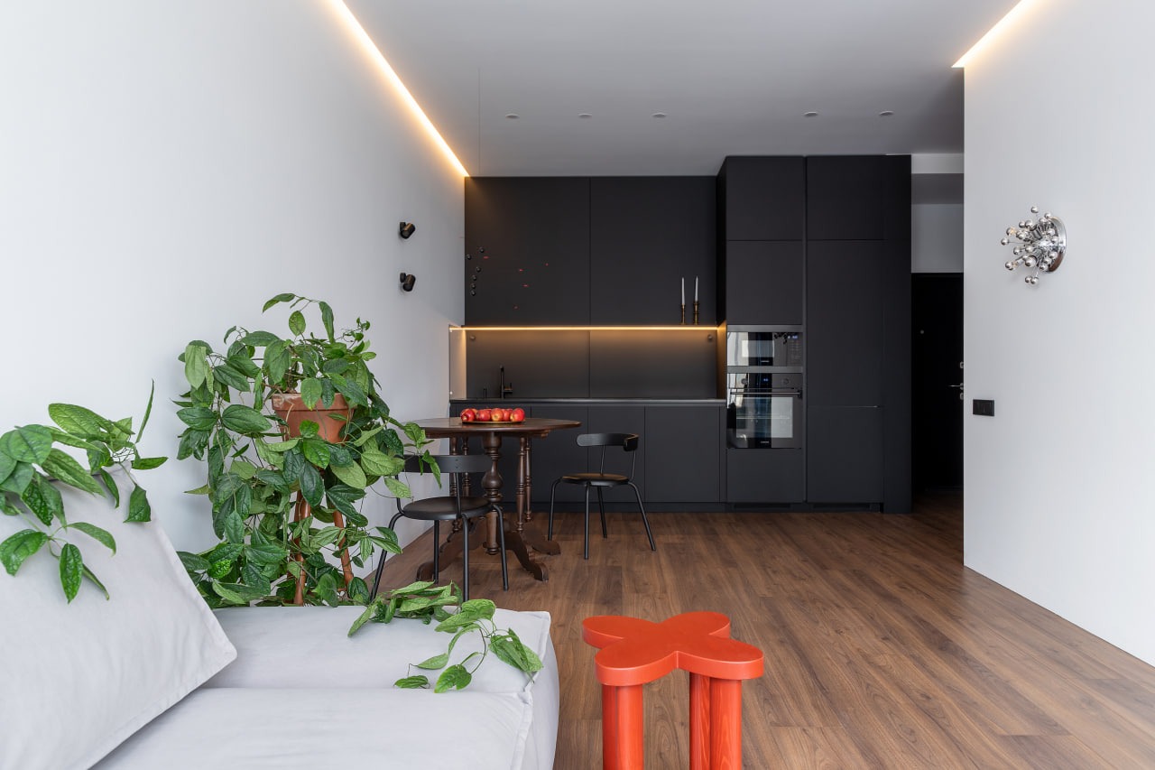 Владельцы квартиры — молодая пара, работают в IT и архитектуре. Это их первое совместное жилье: хотелось создать создать современный интерьер и при этом уложиться в бюджет дизайнерского проекта. Квартира площадью 50 кв. метров имеет просторную кухню-гостиную, спальню, гардеробную и один санузел. Есть большие панорамные окна, выходящие на парк.