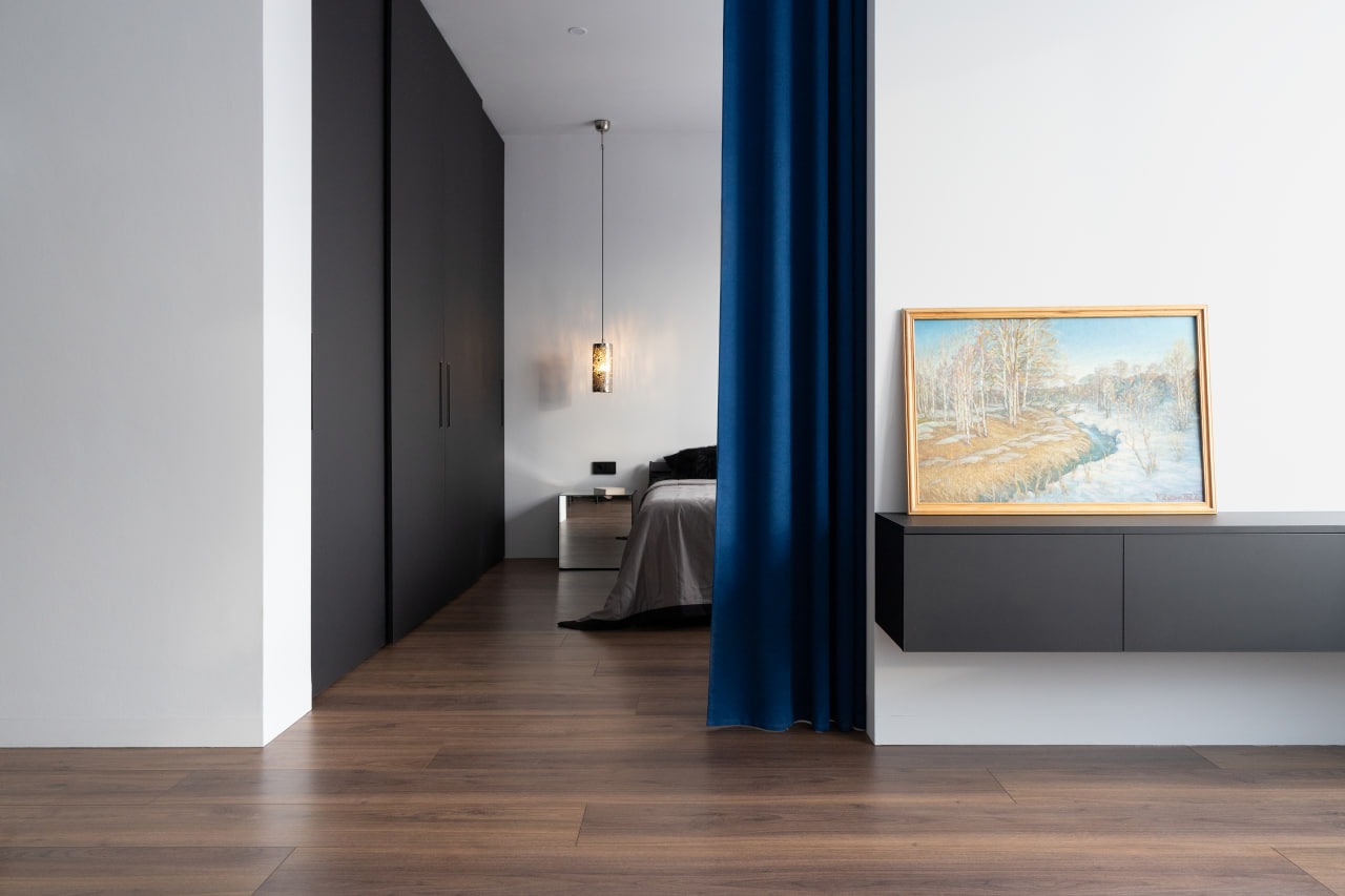 Весь интерьер квартиры сдержанный и монохромный — в основе цветовой гаммы лежат белый, черный и естественный цвет орехового дерева на полу. В качестве основного яркого элемента добавили шторы глубокого синего цвета.