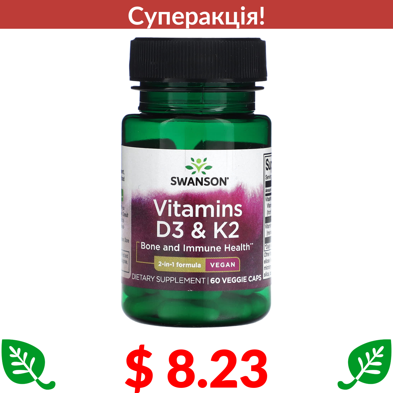 $ 8.23 Swanson, вітаміни D3 і K2, 60 веганських капсул