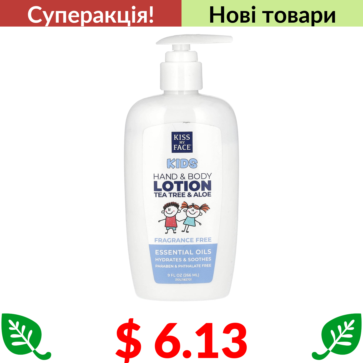 $ 6.13 Kiss My Face, Kids, Hand & Body Lotion, Tea Tree & Aloe, Fragrance Free, 9 fl oz (266 ml)