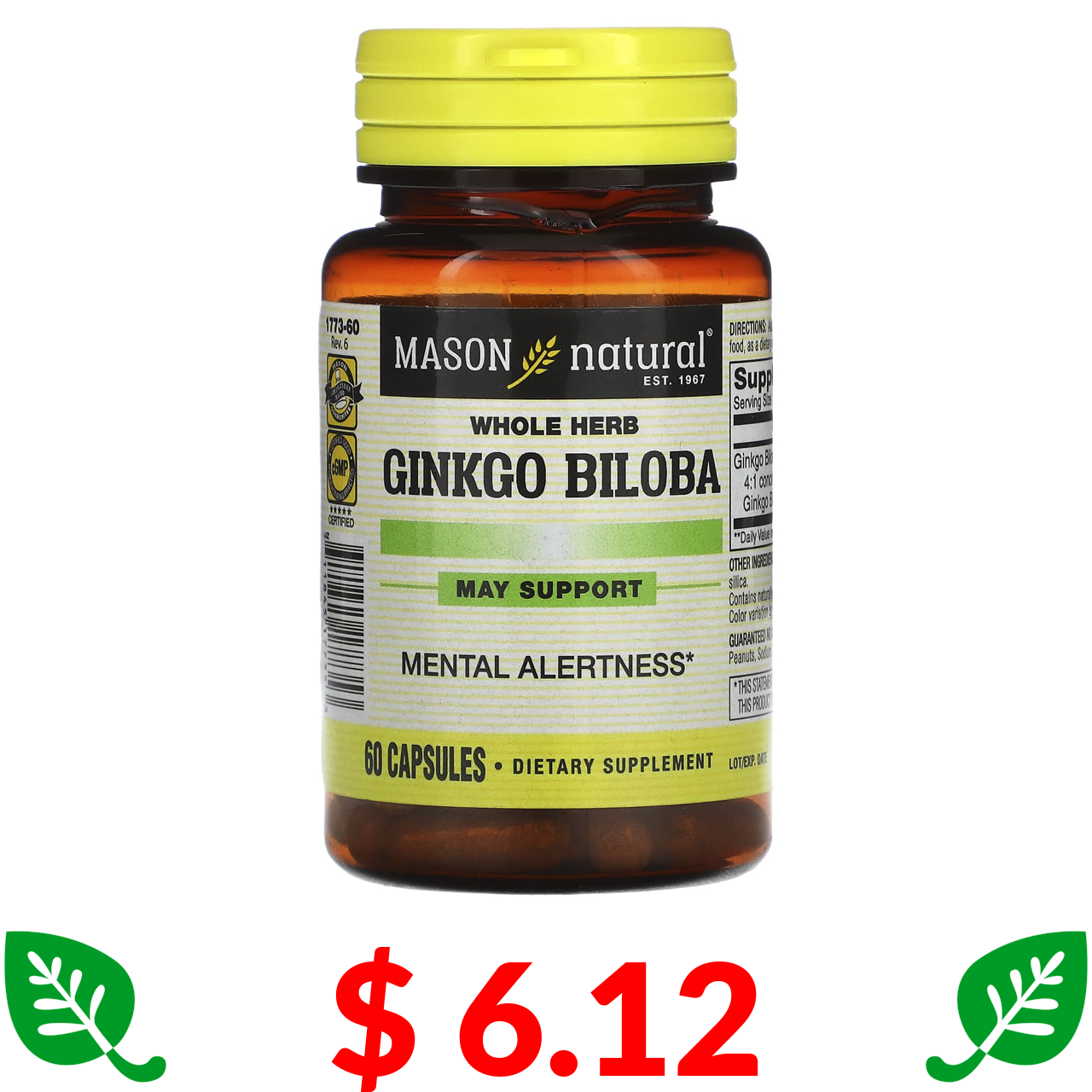 $ 6.12 Mason Natural, гінкго білоба (ціла рослина), 60 капсул