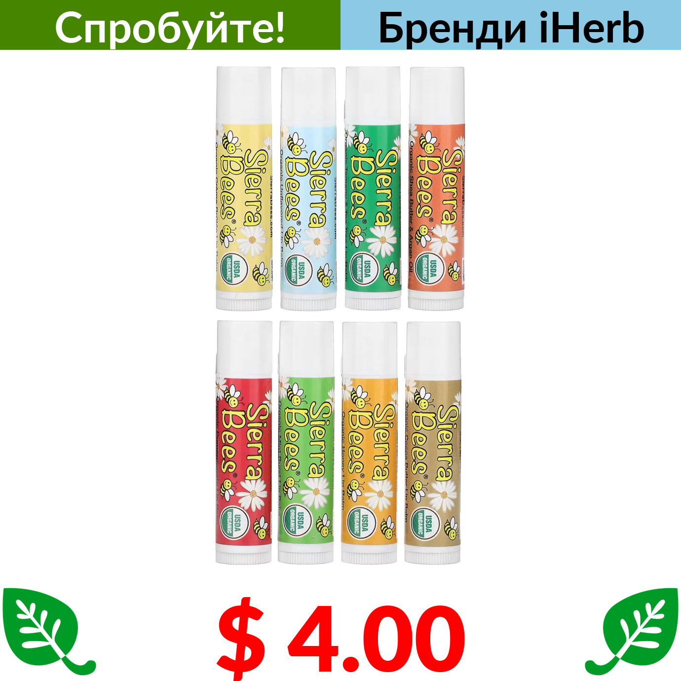$ 4.00 Sierra Bees, набір органічних бальзамів для губ, 8 шт,. по 4,25 г (0,15 унції)