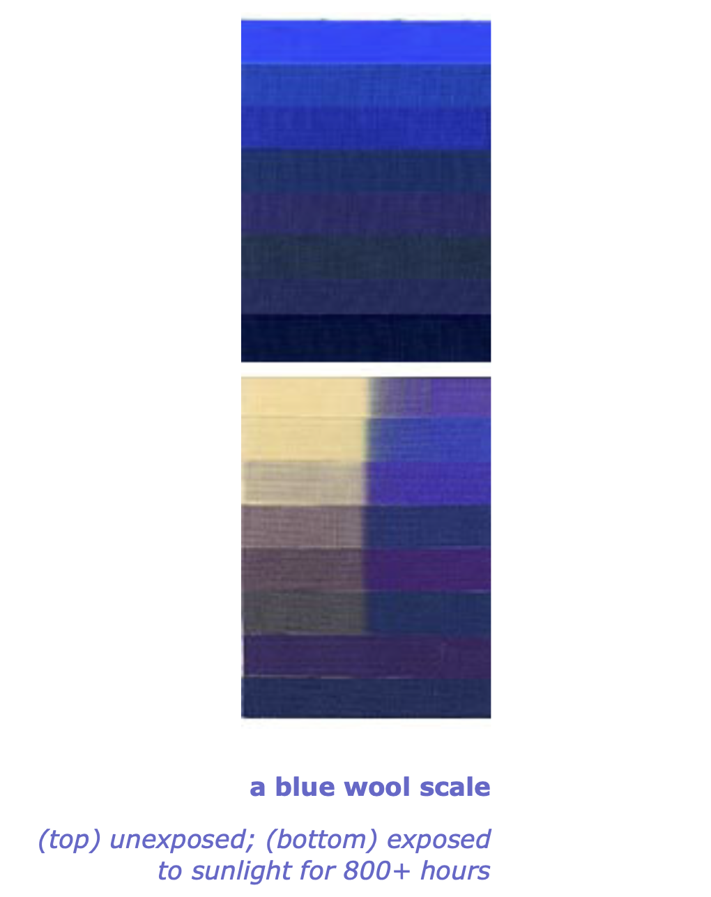 The problem then is to measure the amount of light exposurethe test samples receive. The current solution is the blue wool textile fading card or blue wool scale (at right). This consists of eight strips of wool mounted side by side on a small card; each strip or reference is colored with a blue dye that fades after exposure to a known amount of light. The dyes have been chosen so that each reference takes about two to three times longer to begin fading as the next lower reference in the scale. (Under normal solar testing conditions, reference 1, the least permanent, will begin to fade in 3 hours to 3 days, depending on geographic location, season, cloud cover and humidity; reference 3 will fade in 5 days to 2 weeks; reference 6 in 6 to 16 weeks; and reference 8, the most permanent, in 6 to 15 months.) These scales are used for paint lightfastness testing under international standard ISO 105-B, and are also used by gallery curators to measure the accumulated amount of light received by museum displays of paintings, textiles or photographic prints.