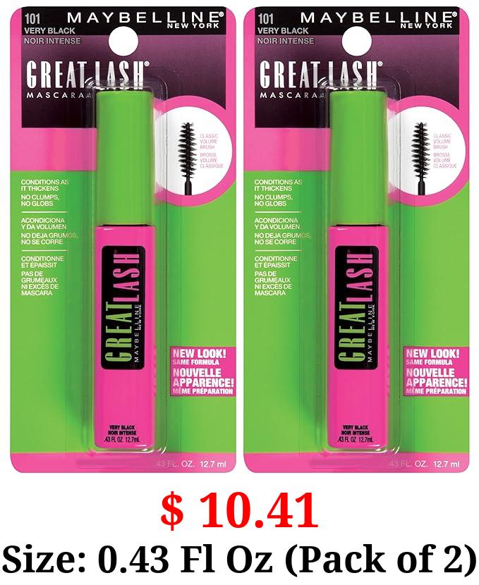$ 10.41 Size: 0.43 Fl Oz (Pack of 2) Maybelline Great Lash Washable Mascara Makeup, Volumizing Lash-Doubling Formula That Conditions As It Thickens, Very Black, 2 Count