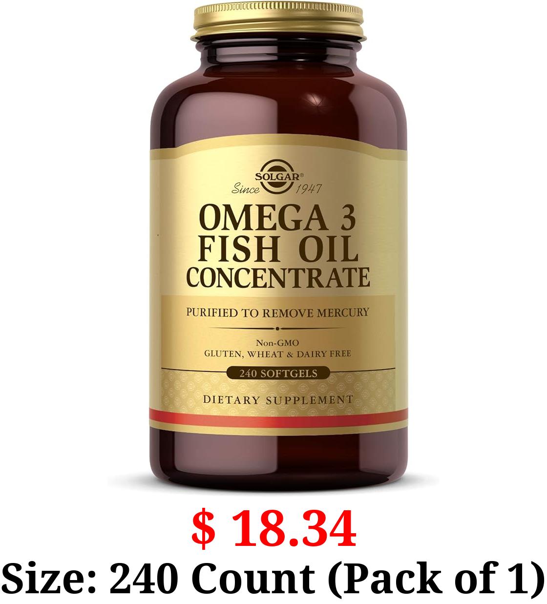 $ 18.34 Size: 240 Count (Pack of 1) Solgar Omega-3 Fish Oil Concentrate, 240 Softgels - Support for Cardiovascular, Joint & Brain Health - Contains EPA & DHA Fatty Acids - Non GMO, Gluten/ Dairy Free - 120 Servings