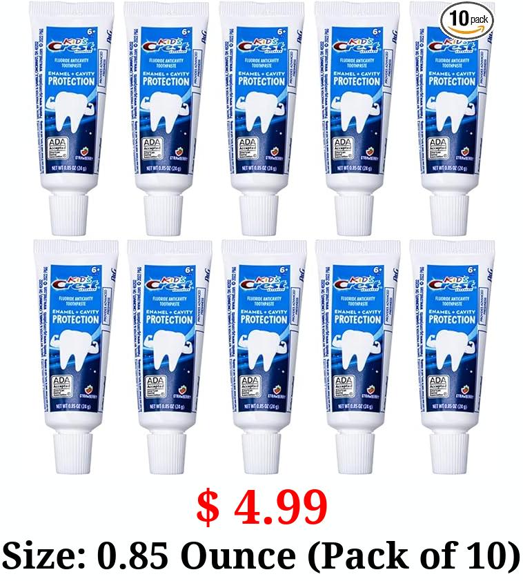 $ 4.99 Size: 0.85 Ounce (Pack of 10) Crest Kids Advanced Toothpaste, Junior Toothpaste 6+ Years Old Enamel + Cavity Protection with Strawberry Flavor, Travel Size 0.85oz (24g) - Pack of 10