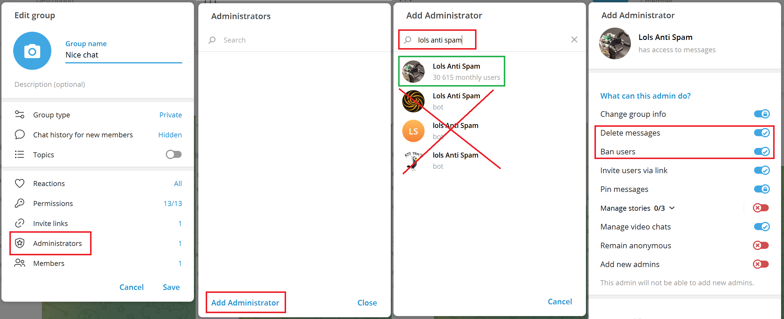Manage group -> Administrators -> Add Administrator -> lolsbotcatcherbot -> Save
