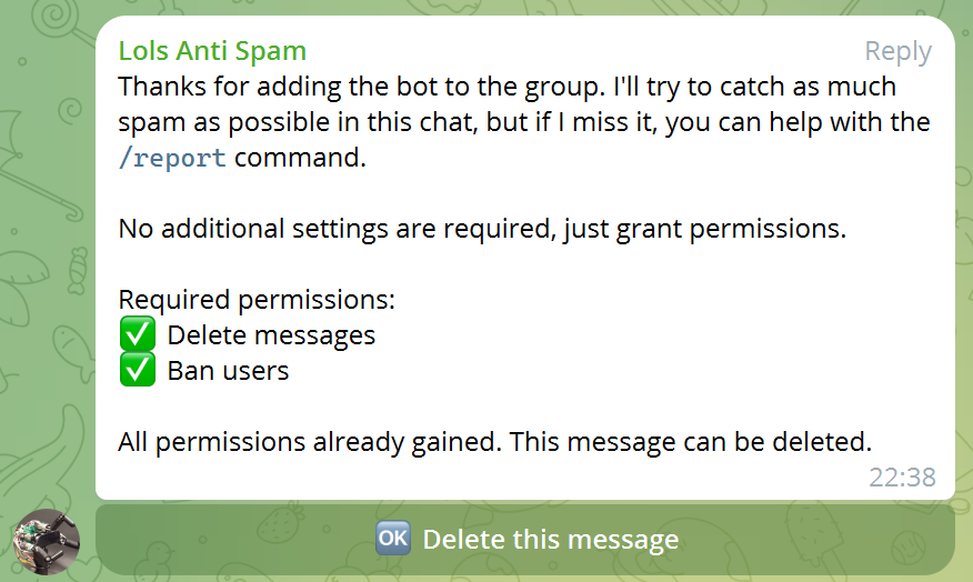 ⬤) Telegram bots do not see actions of other bots, so one anti-spam bot will not interfere with another. Additionally, if Lols Bot attempts to delete a message that another bot has already deleted, it will not send a message about that spammer to the chat, assuming the other bot has already handled it.