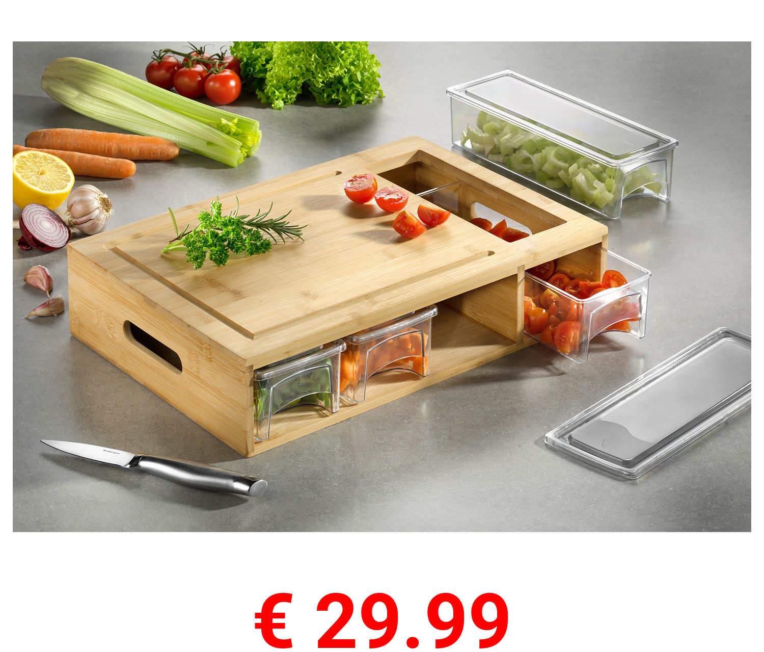 € 29.99 Esmeyer Schneidbrett aus Bambusholz mit 4 Acrylschubladen inkl. Deckel