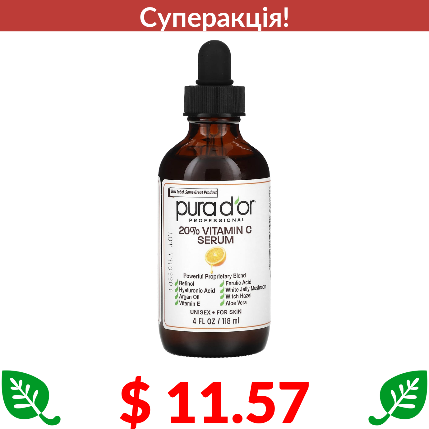 $ 11.57 Pura D'or, Professional, сироватка з вітаміном С, 118 мл (4 рідк. унції)