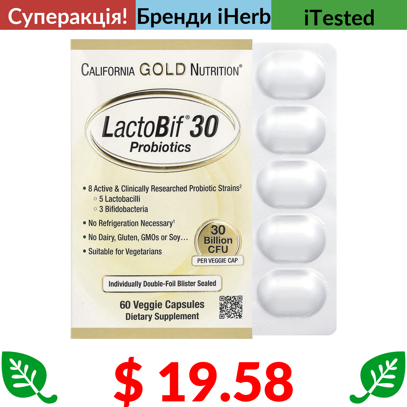 $ 19.58 California Gold Nutrition, LactoBif 30, пробіотики, 30 млрд КУО, 60 вегетаріанських капсул