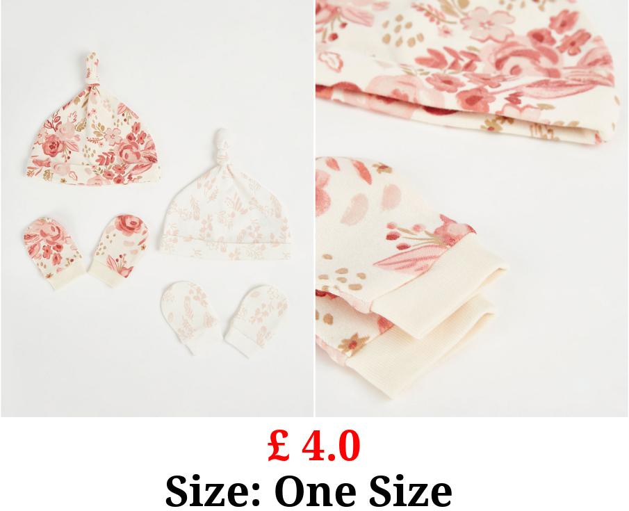 £ 4.0 Pink Floral Hat and Scratch Mitts 2 Pack