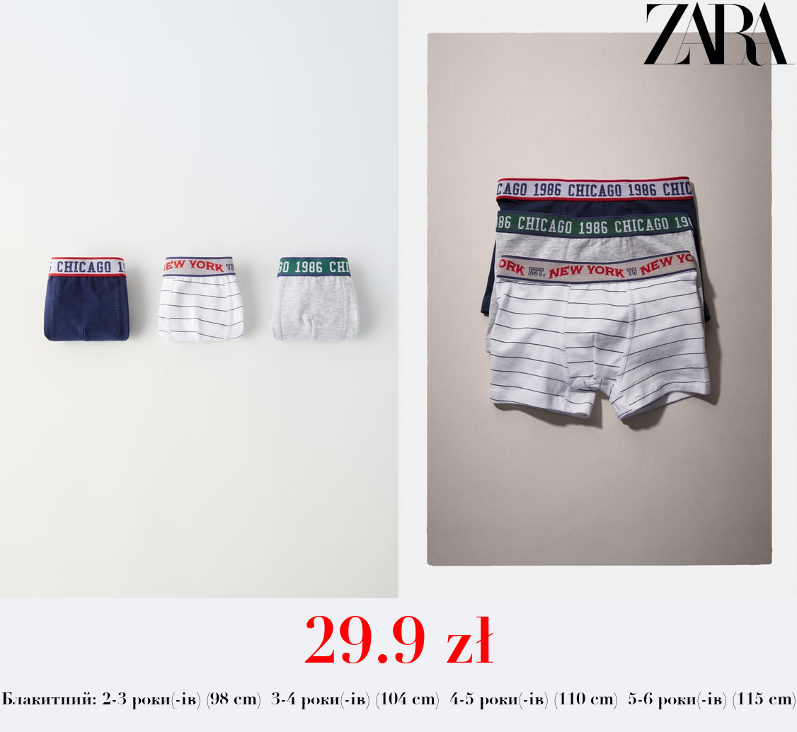 29.9 zł 2–6 РОКІВ/ НАБІР ІЗ ТРЬОХ ТРУСИКІВ-БОКСЕРІВ В УНІВЕРСИТЕТСЬКОМУ СТИЛІ
