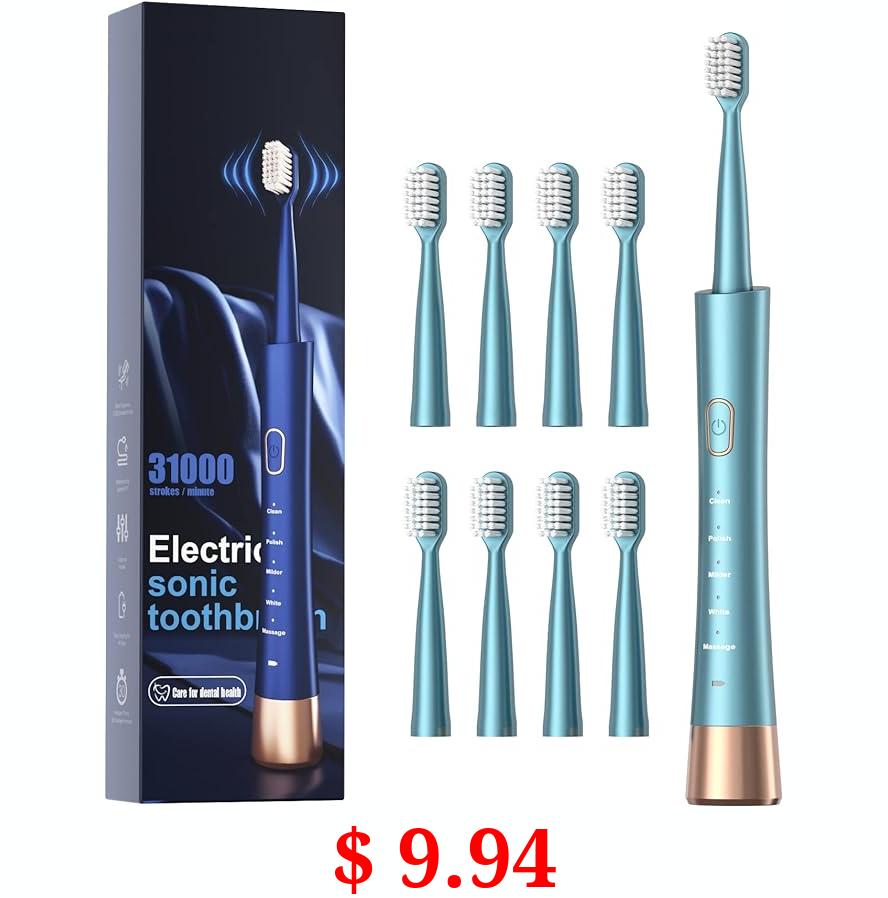 $ 9.94 USB Rechargeable Sonic Electric Toothbrush for Adults, Powered Motor High Vibration Teeth & Gum Care, Soft Dupont Brush Heads, 2 Minutes Timer 5 Modes, Green