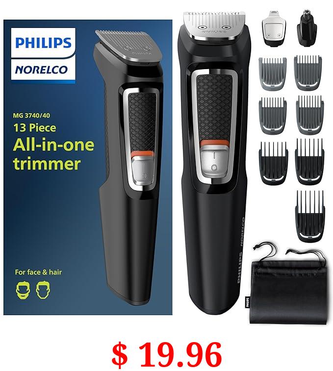 $ 19.96 Philips Norelco Multi Groomer All-in-One Trimmer Series 3000-13 Piece Mens Grooming Kit for Beard, Face, Nose, Ear Hair Trimmer and Hair Clipper - NO Blade Oil Needed, MG3740/40