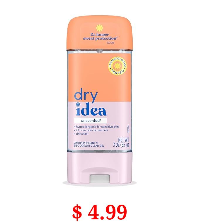 $ 4.99 Dry Idea Gel Deodorant & Antiperspirant | 2X Longer Sweat Protection | 72-Hour Odor Protection | Unscented & Hypoallergenic for Sensitive Skin, 3 oz.