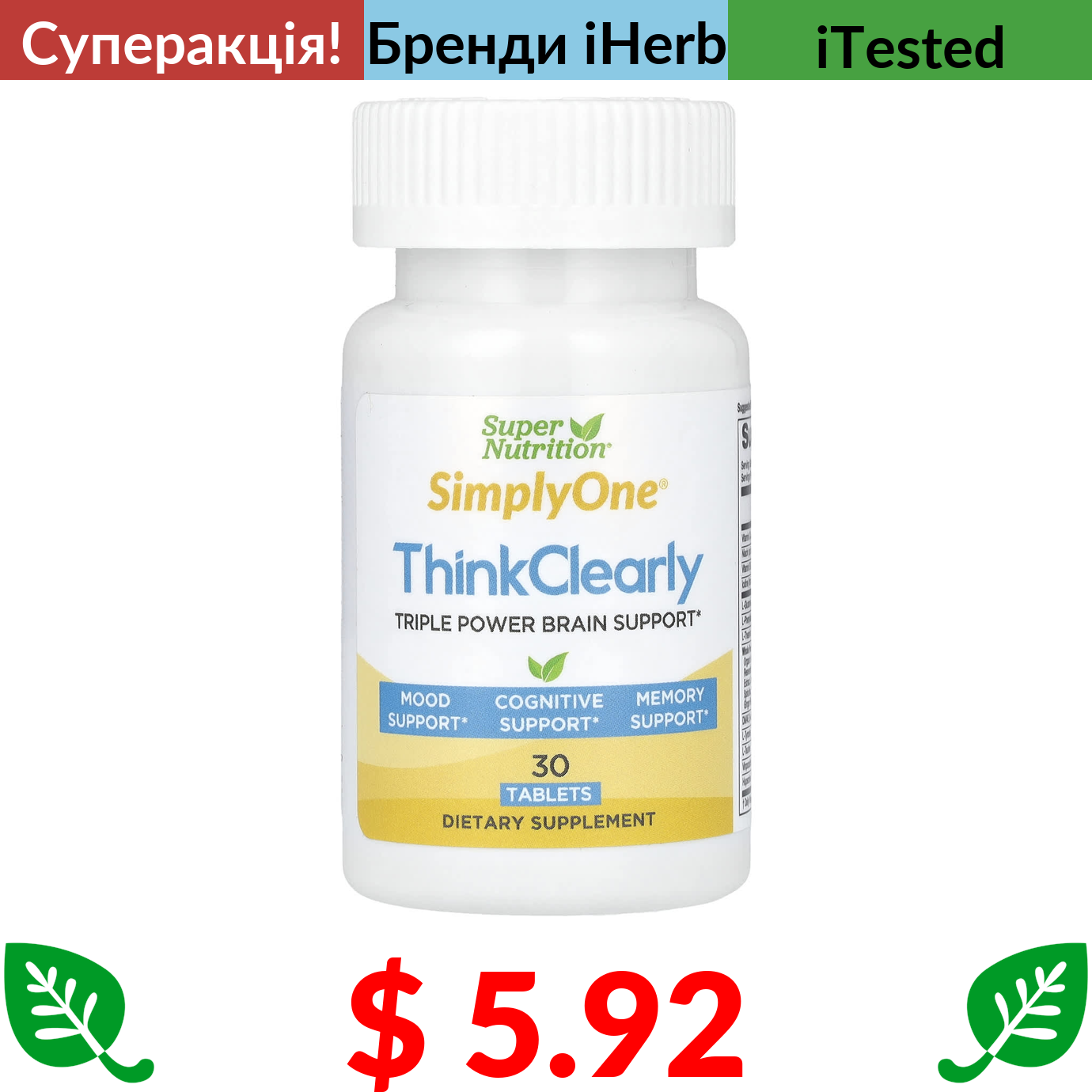 $ 5.92 Super Nutrition, SimplyOne, покращення розумової активності, 30 таблеток