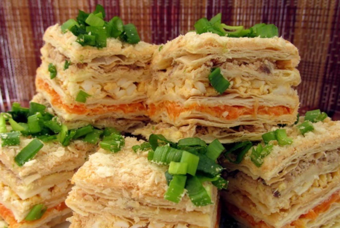 Закусочный наполеон из слоеного 106 фото