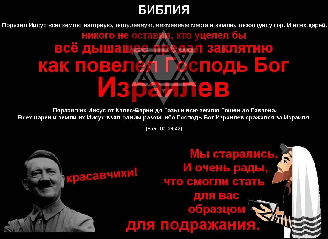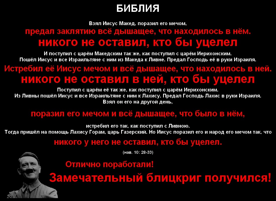 PavelВ десятой главе Иисус со своей ордой избранных богом скотоводов совершает свой кровавый рейд по Палестине, тотально уничтожая её коренное население. (нав. 10: 28-42) Иегова же, помогая своим подопечным, кидает с неба камни града, чтобы число погибших людей было ещё больше. (нав. 10: 11) Над пленными царями Иисус сначала издевается, а потом вешает их на деревьях. (нав. 10: 20, 22-26)