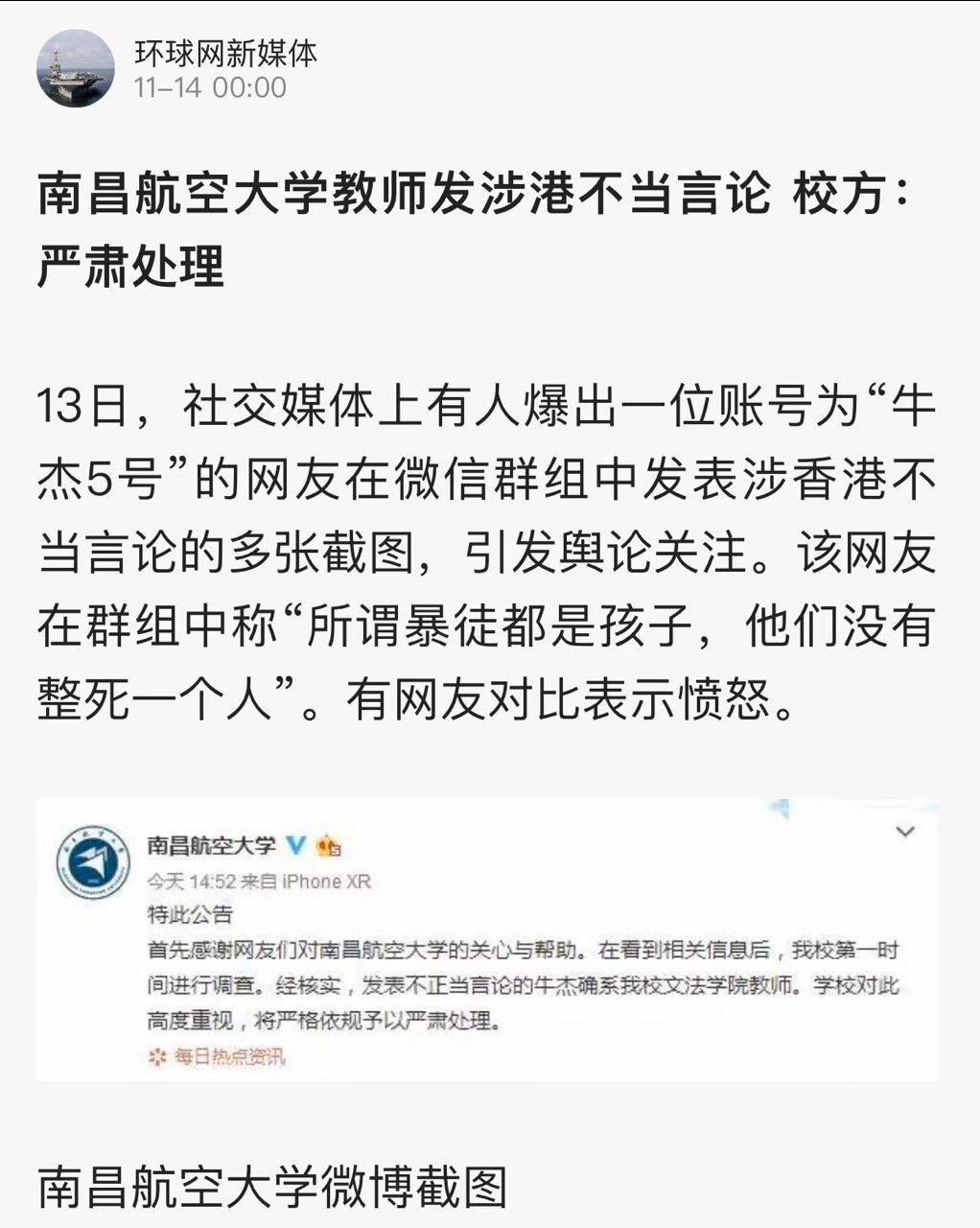 南昌航空大学官微在当日14:52发布公告说,牛杰确系该校文法学院教师,学校将“严格依规予以严肃处理”。