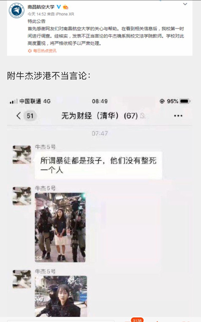 11月13日,南昌航空大学副教授牛杰因在微信群内质疑中共对香港学生的“暴徒”定性,发布香港烧人事件疑点及传播学生被捕、受伤真相,遭举报。随后警方介入,牛杰同时面临校方处理,引发外界关注。