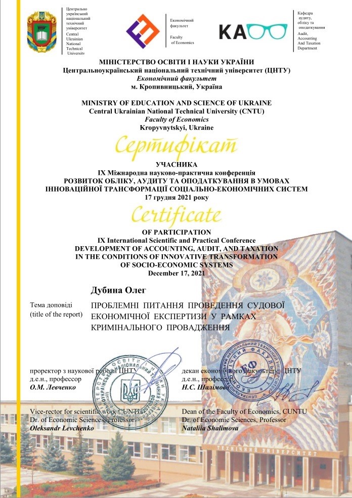 Черкаський науково-дослідний експертно-криміналістичний центр МВС УкраїниНа базі економічного факультету Центральноукраїнського національного технічного університету в м. Кропивницькому 17 грудня 2021 року відбулася Міжнародна науково-практична конференція «Розвиток обліку, аудиту та оподаткування в умовах інноваційної трансформації соціально-економічних систем»