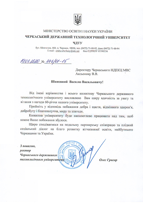 ПОДЯКА ВІД ЧЕРКАСЬКОГО ДЕРЖАВНОГО ТЕХНОЛОГІЧНОГО УНІВЕРСИТЕТУЧеркаський НДЕКЦ МВС УкраїниЧеркаський НДЕКЦ МВС України