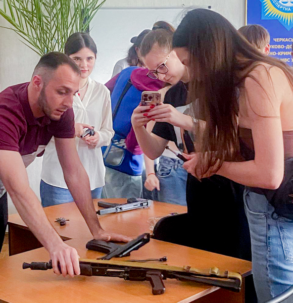 Заключна частина екскурсії була присвячена ознайомленню з дослідженнями зброї та оглядом колекції зброї Центру, що зазвичай викликає захоплення та інтерес, оскільки дітям в присутності експертів-балістів дозволяють потримати зброю в руках.