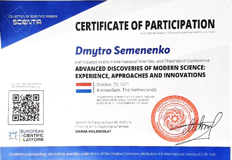 Так, 29.10.2021 завідувач сектору дактилоскопічних обліків відділу криміналістичних видів досліджень Черкаського НДЕКЦ МВС Дмитро Семененко взяв участь у ІI-й міжнародній науково-теоретичній конференції «Теоретичні та практичні наукові досягнення: дослідження та результати їх впровадження», проведеної Європейською науковою платформою в м. Амстердам (Нідерланди).