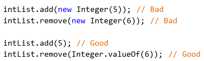 Пожалуй, большинство людей хотя бы раз в жизни использовало конструктор new Integer(int). Это могло случиться либо по незнанию, либо по той причине, что до Java 1.5 это было единственным способом оборачивания int в Integer. Однако, начиная с Java 1.5, этот вызов стал в большинстве случаев необязательным, и вместо него рекомендованным и более эффективным способом обёртки стали метод Integer.valueOf и автобоксинг: