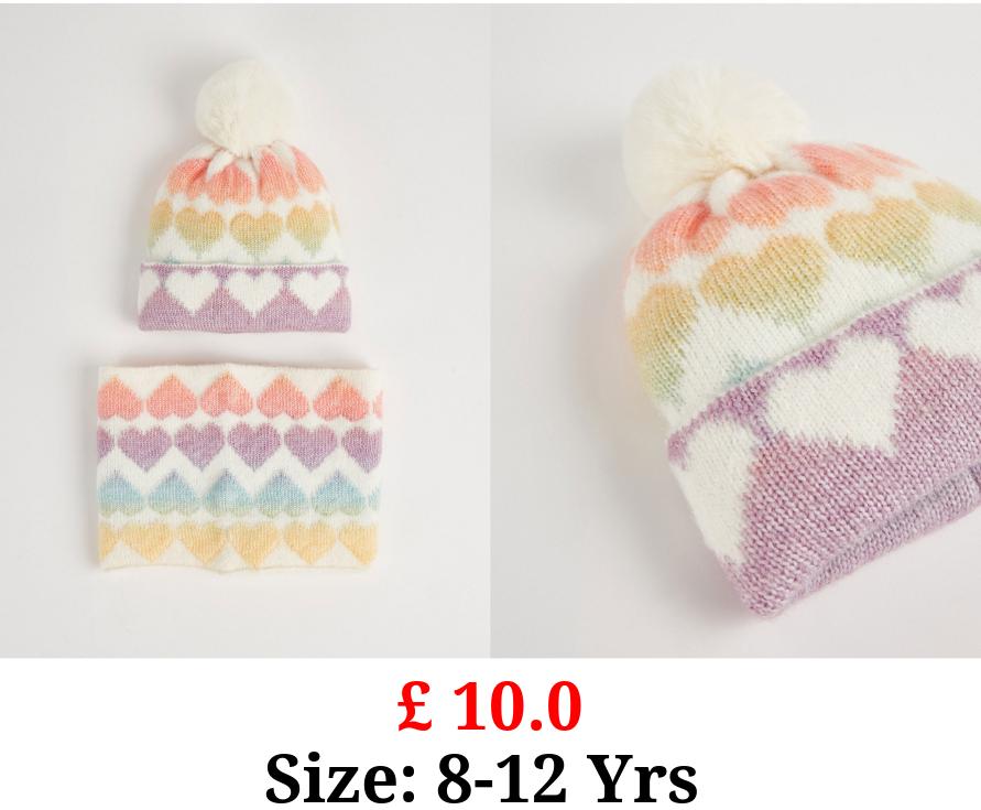 £ 10.0 Rainbow Heart Bobble Hat and Snood 2 Piece Set