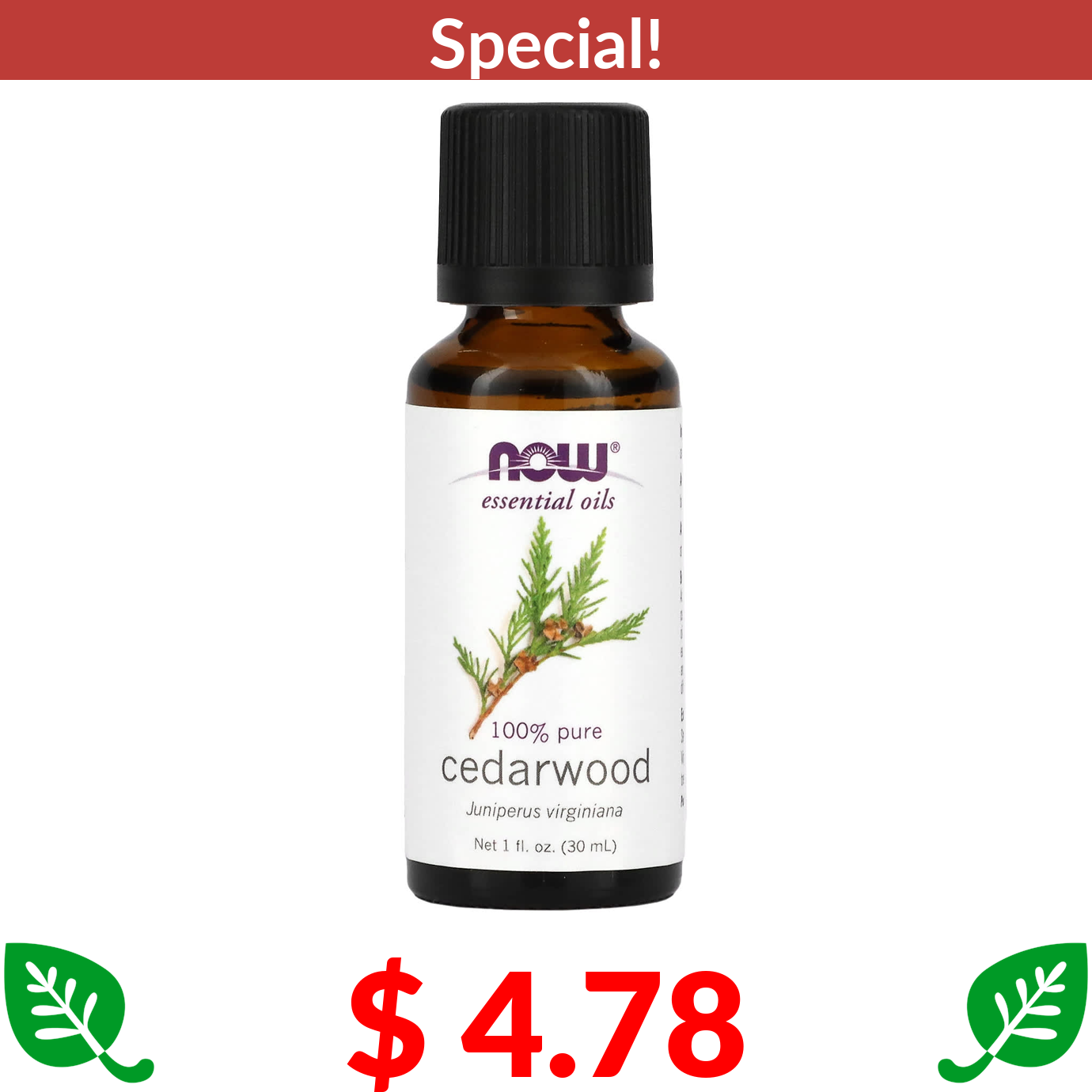 $ 4.78 NOW Foods, Essential Oils, Cedarwood, 1 fl oz (30 ml)