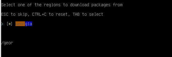 4. We will start the installation from setting up mirrors, which is option 3. Then you need to find your city/region. In my case it would be Georgia.
