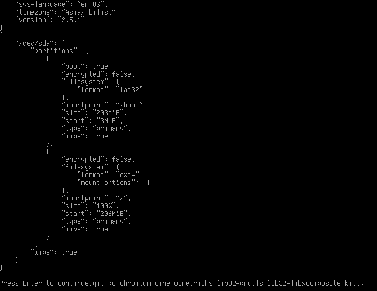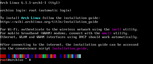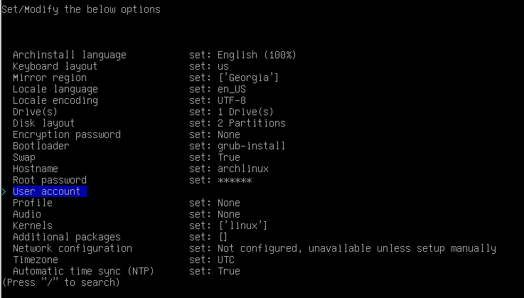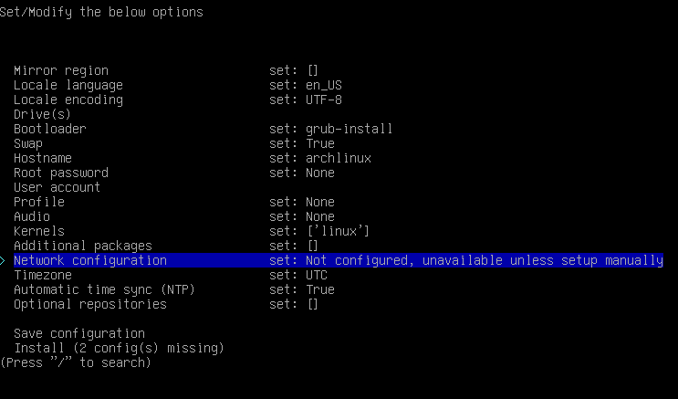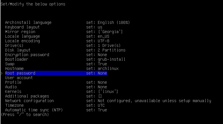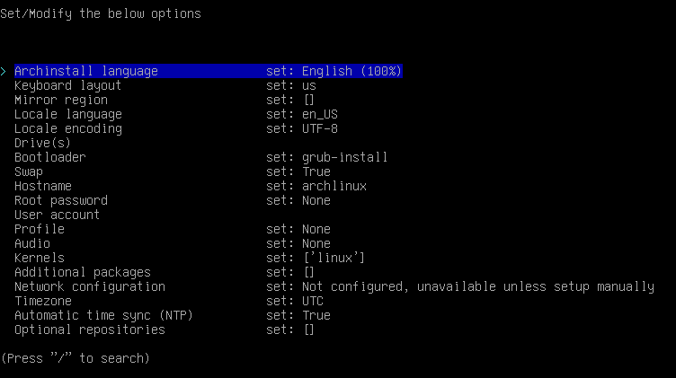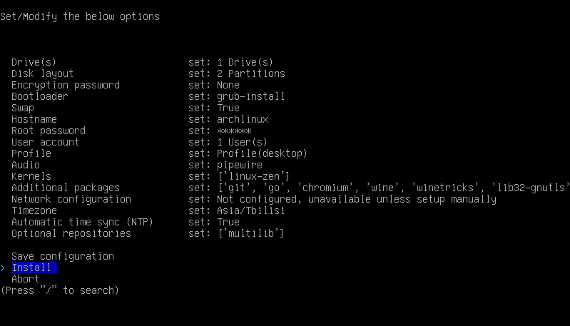 3. Type the archinstall command to get into install settings
