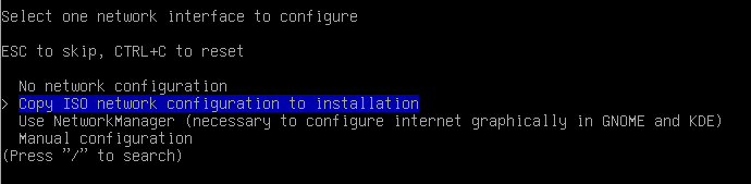 14. We are installing Arch Linux on your PC, not flash drive, so you need to copy the network setting from the USB drive. Choose Network configuration.