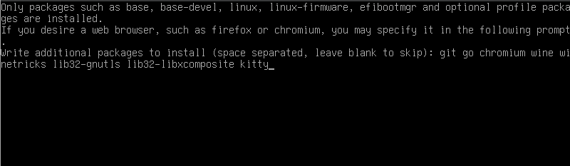 git go chromium wine winetricks lib32-gnutls lib32-libxcomposite kitty rofi nemo flameshot