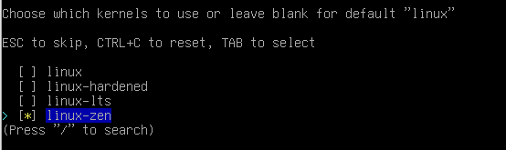 9. Choose Kernels, then find linux-zen and tick it using SpaceBar (as shown on the photo below)