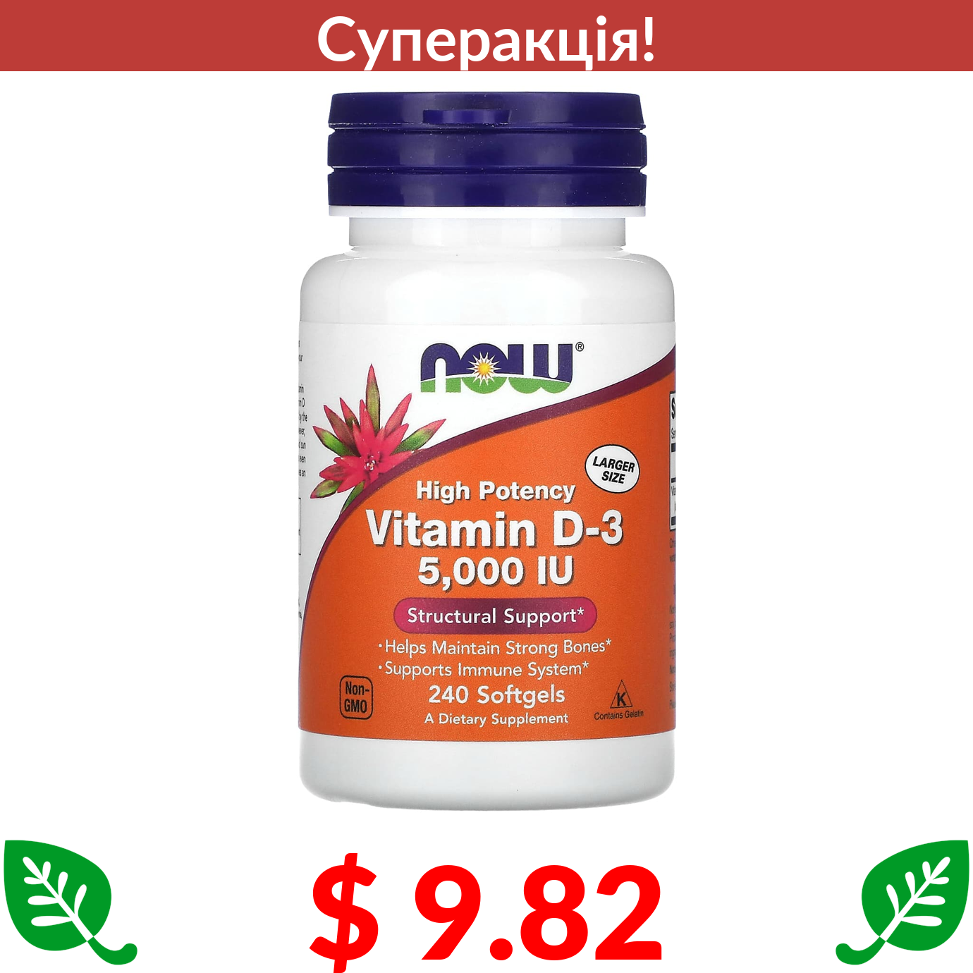 $ 9.82 Now Foods, високоефективний вітамін D3, 125 мкг (5000 МО), 240 капсул