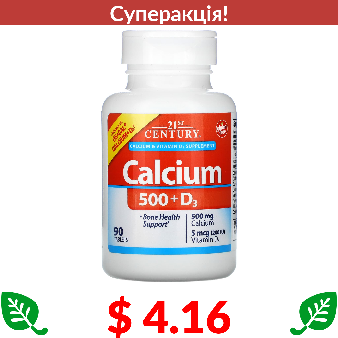 $ 4.16 21st Century, кальцій 500 з вітаміном D3, 90 таблеток