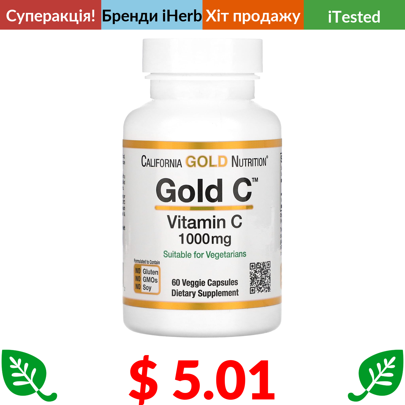 $ 5.01 California Gold Nutrition, Gold C, вітамін С, 1000 мг, 60 вегетаріанських капсул