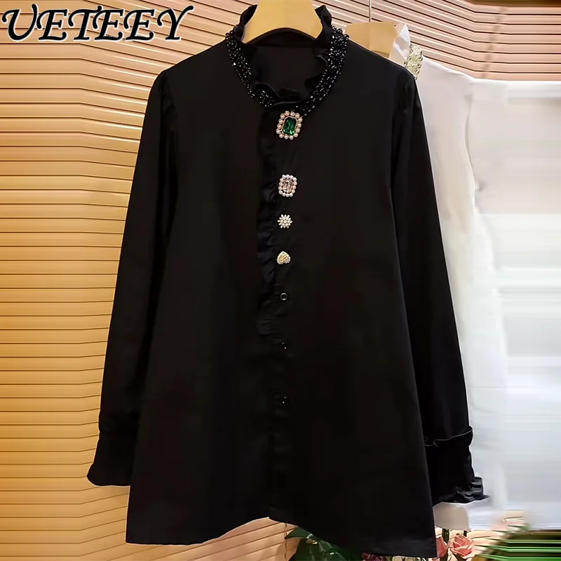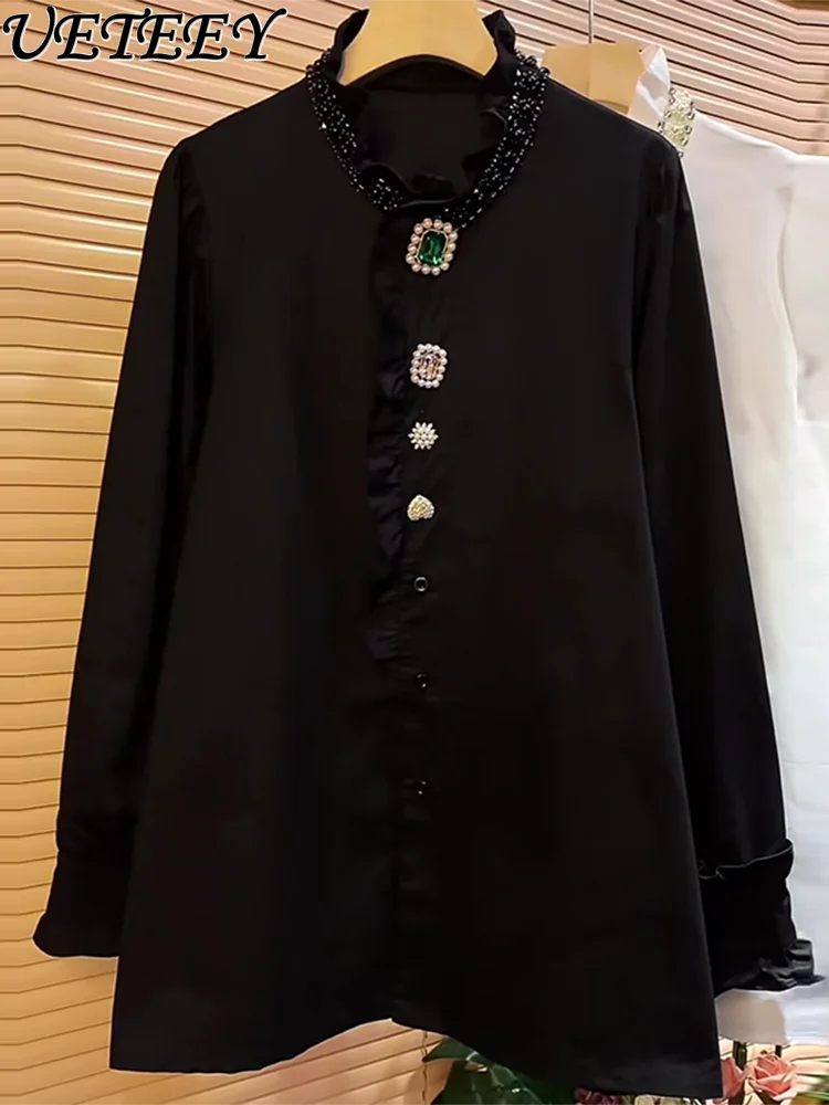 UHBzvrCQCHere you can buy oversize Women's Clothing Commute Style Top Hot Rhinestone Black Stand Collar Ruffled Long Sleeve Slimming All-Matching Shirt with free delivery to your post office.