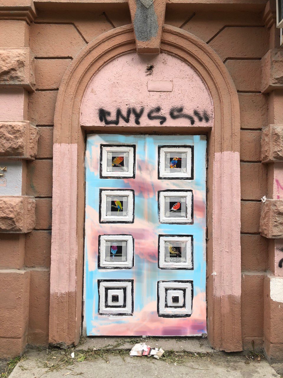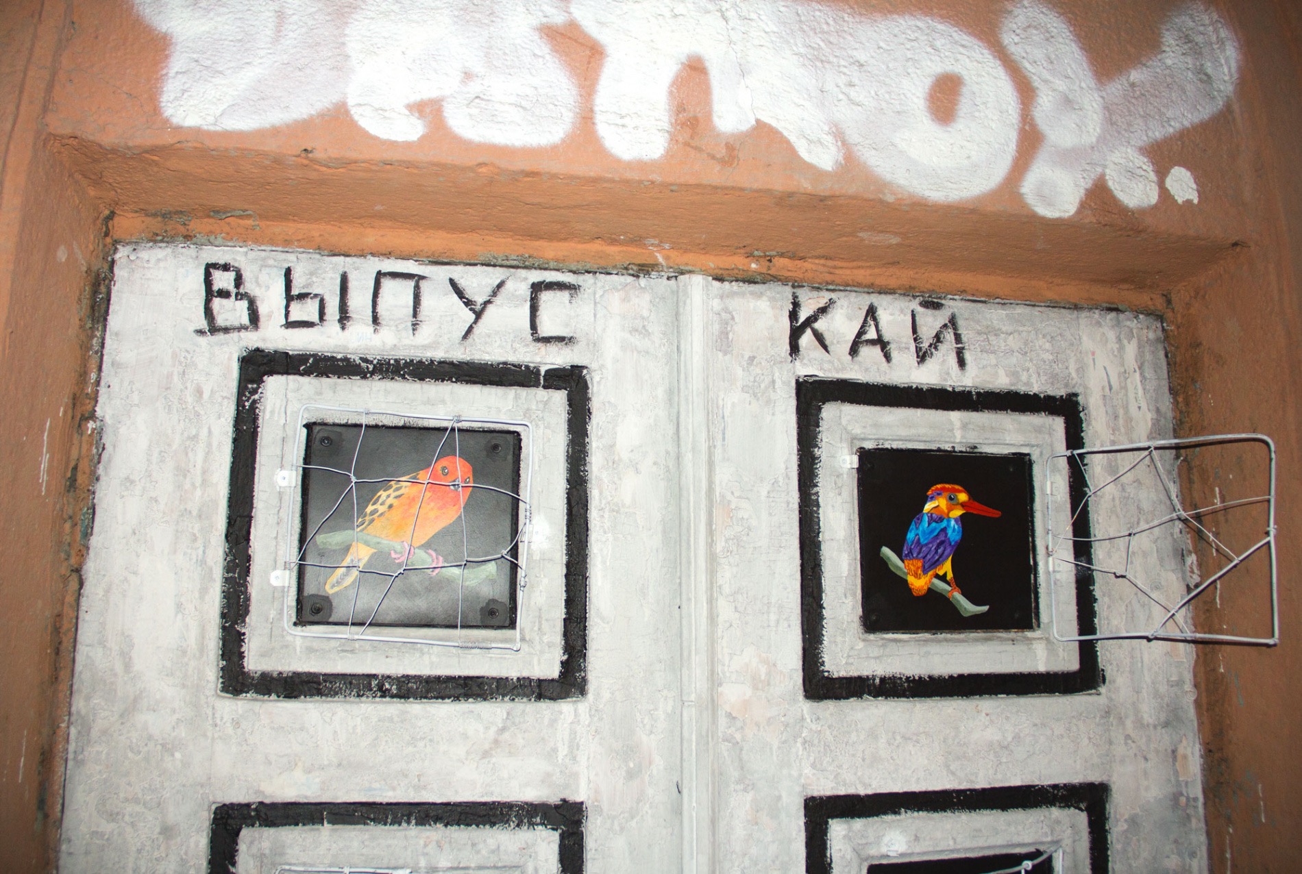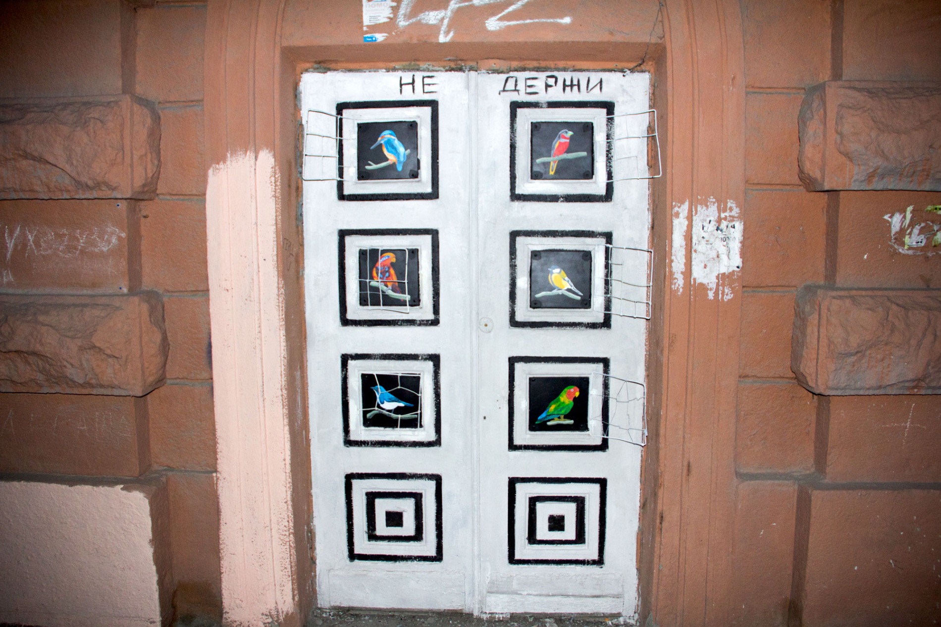 Птицы в двери до сих пор оригинальные, при покраске их закрыли малярным скотчем, чтобы не повредить. А вот разлетевшаяся по медиа версия работы без решетки — это просто ранняя версия.