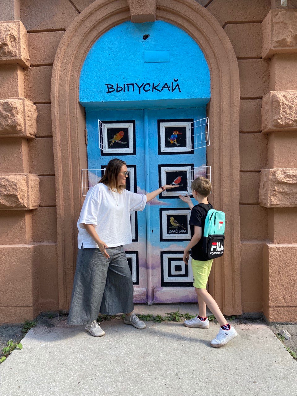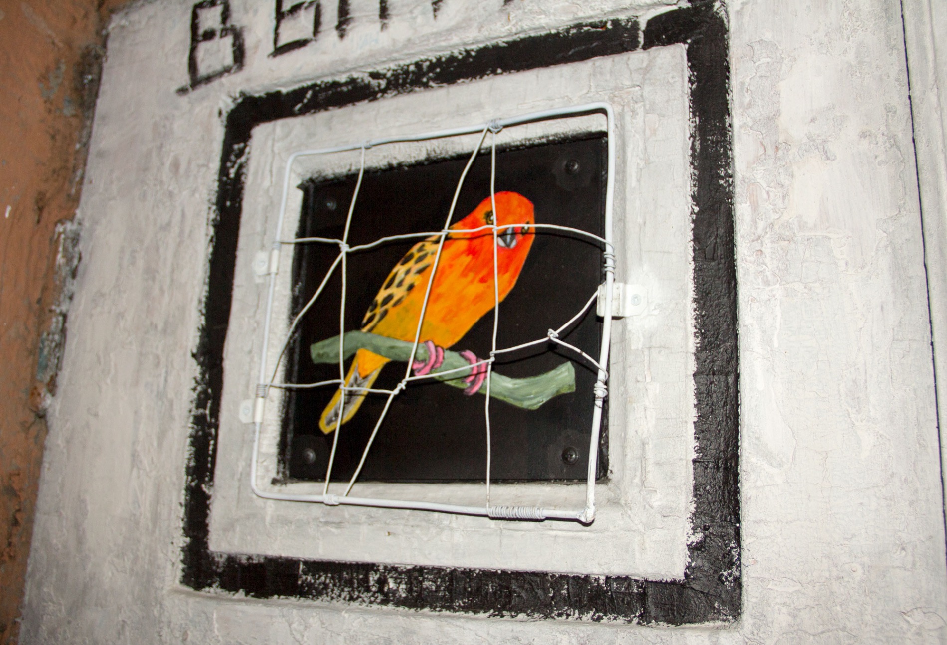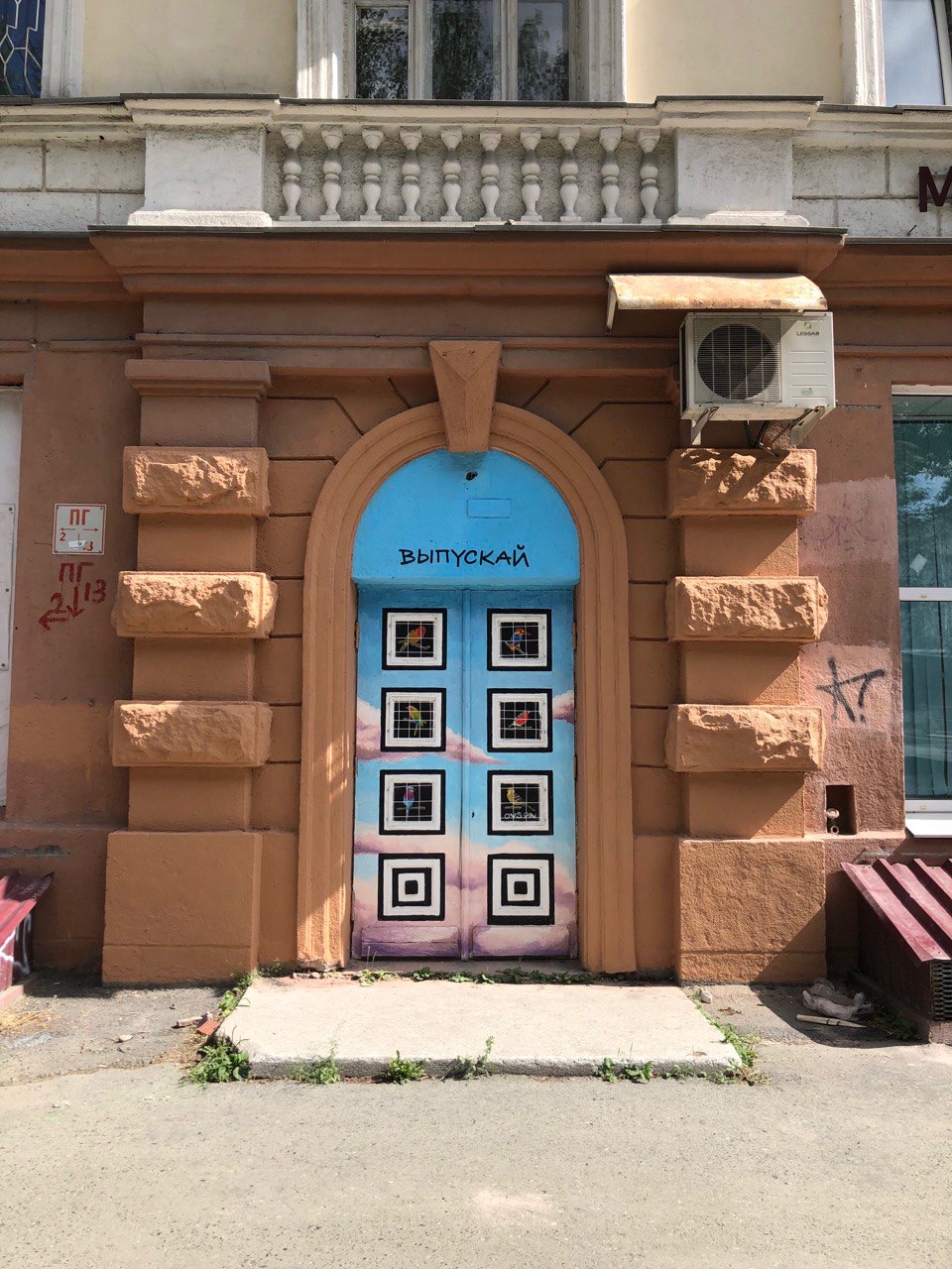 Птицы в двери до сих пор оригинальные, при покраске их закрыли малярным скотчем, чтобы не повредить. А вот разлетевшаяся по медиа версия работы без решетки — это просто ранняя версия.