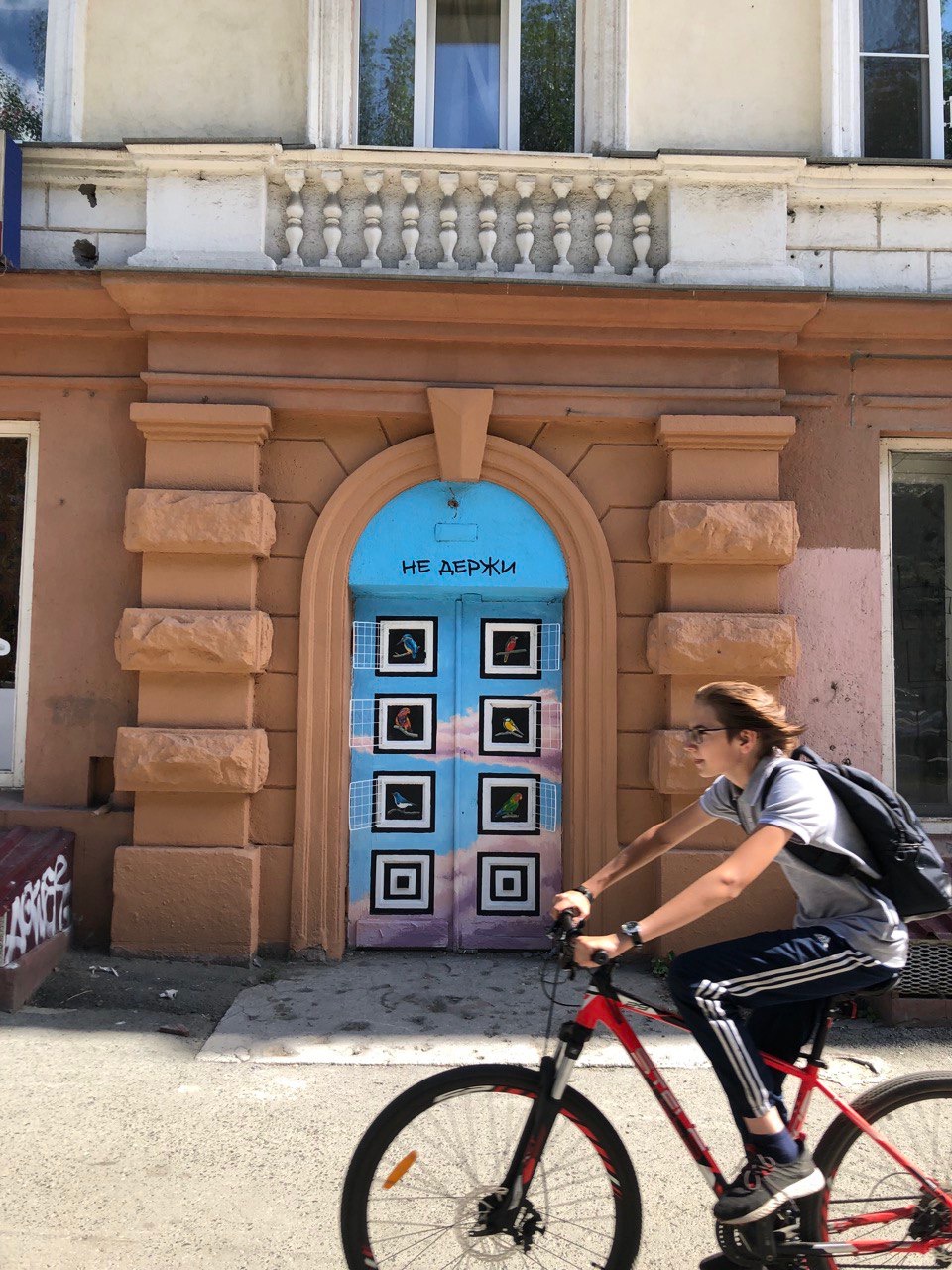 Неравнодушного к арту горожанина зовут Андрей — также, как и Овсяна, так что некая преемственность тут прослеживается. Простого обновления Андрею (не Овсяну) было мало, так что он решил добавить немного своего, нарисовать небо вместо белых дверей. Подходящего референса он не находил, пока случайно не наткнулся на него, гуляя по Екатеринбургу.